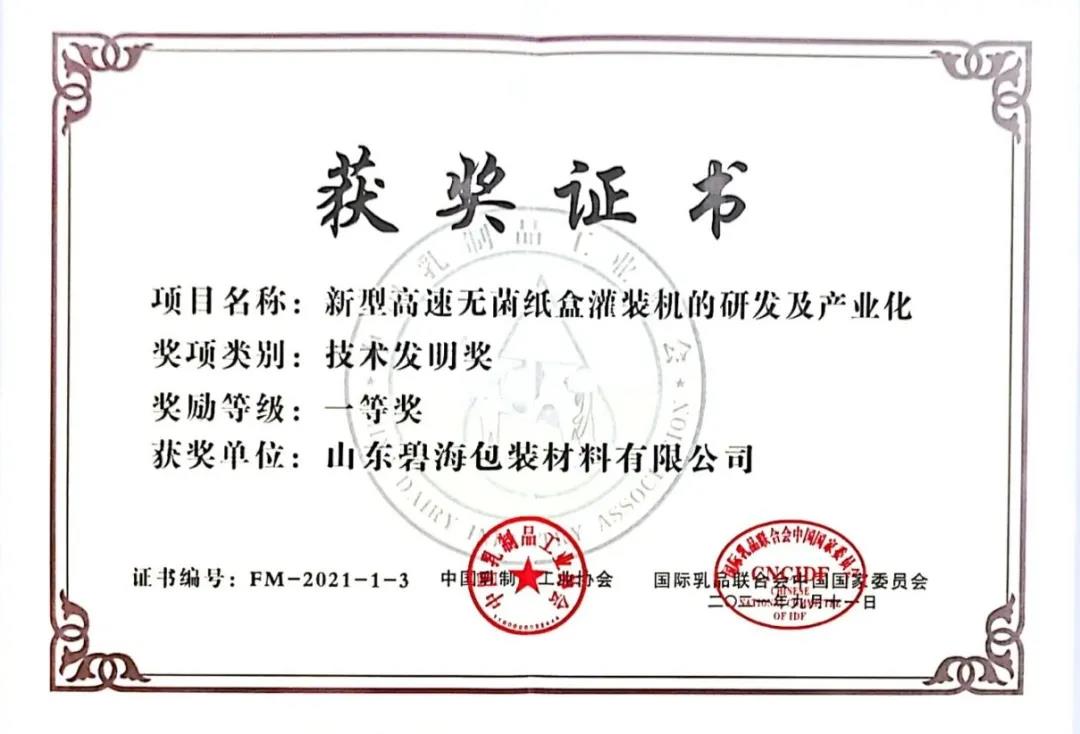 11日,在2021年度中國乳業科技系列頒獎盛典上,碧海包裝又一新型高速無菌紙盒灌裝機獲技術發明獎一等獎,公司執行總經理王立上臺接受頒獎。