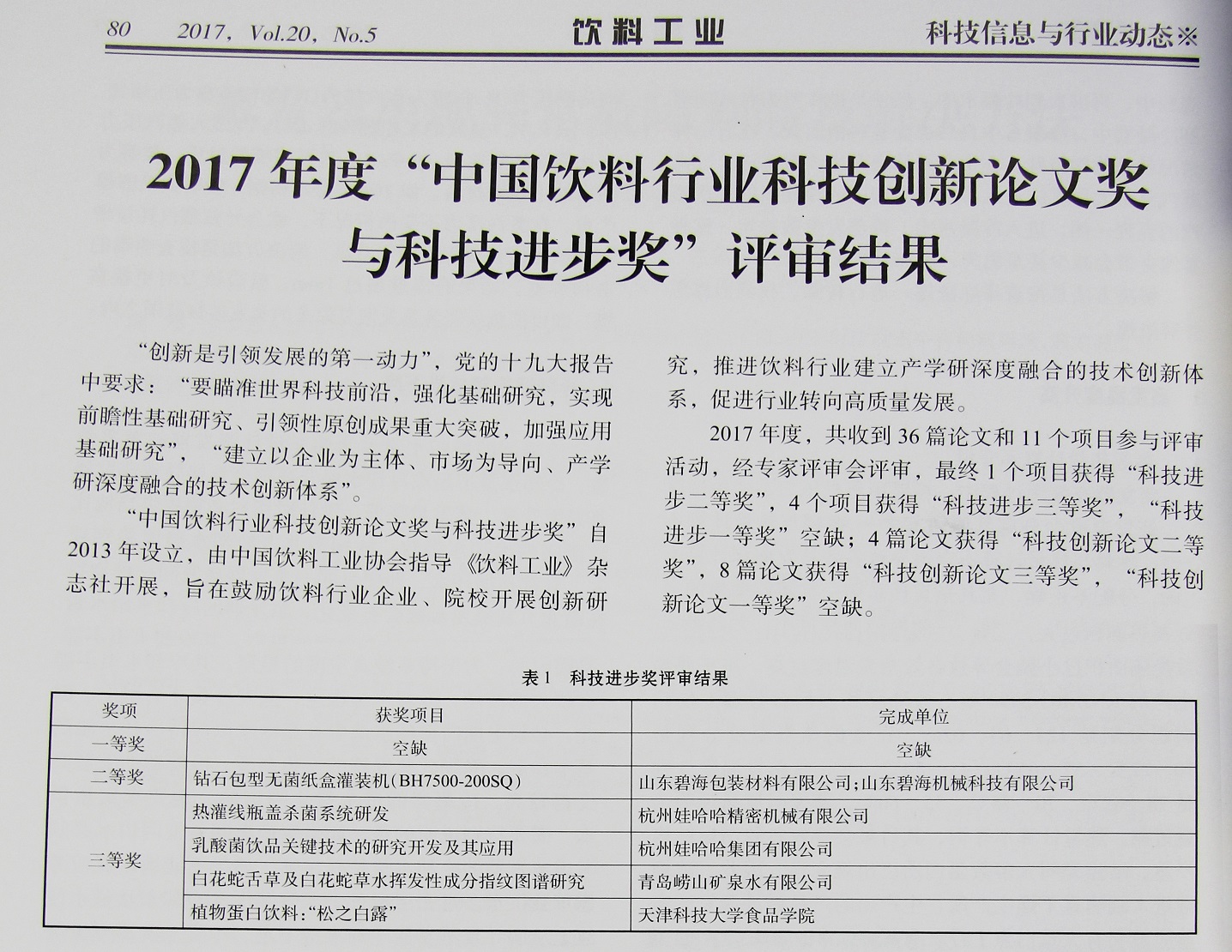 2017年11月21-24日,中國飲料工業(yè)協(xié)會年會、第八屆中國國際飲料工業(yè)科技展、“2017中國飲料行業(yè)科技創(chuàng)新論文獎與科技進(jìn)步獎”頒獎活動在上海新國際博覽中心同期舉行,經(jīng)中國飲料工業(yè)協(xié)會評定,我公司的《鉆石包型無菌紙盒灌裝機(jī)(BH7500-200SQ)》項目榮獲“中國飲料行業(yè)科技進(jìn)步獎”二等獎。